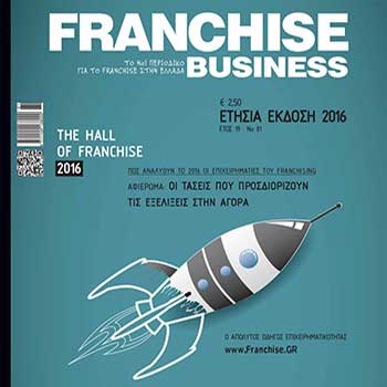 Στο νέο τεύχος μπορείτε να ενημερωθείτε για τις καλύτερες επιχειρηματικές προτάσεις franchise για το 2016. Οι πλέον καταξιωμένες αλλά και οι ταχύτερα αναπτυσσόμενες αλυσίδες franchise σάς περιμένουν στο νέο τεύχος του περιοδικού, ώστε να επανακαθορίσετε το επαγγελματικό και επιχειρηματικό μέλλον σας, εκμεταλλευόμενοι τα προνόμια του franchising.