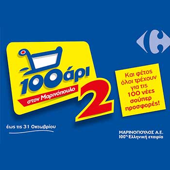 Για 2η συνεχόμενη χρονιά, από τις 18 Σεπτεμβρίου έως τις 31 Οκτωβρίου, 100 μοναδικές προσφορές περιμένουν τους καταναλωτές στα καταστήματα της Μαρινόπουλος σ’ όλη την Ελλάδα.