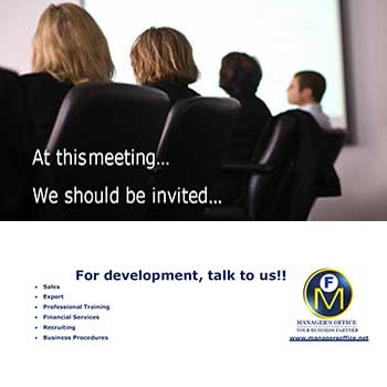 Με αφορμή την νέα χρονιά, η Manager's Office λόγω της εξειδίκευσης που έχει στο restructuring και ειδικά σε πωλήσεις, εξαγωγές και marketing, προσκαλεί κάθε ελληνική επιχείρηση να συζητήσει μαζί της για θέματα ανάπτυξης. Η εξειδίκευση που έχει η Manager's Office είναι σε επίπεδο μόνο εφαρμογής καθώς έχει ασχοληθεί σχεδόν με κάθε κλάδο στην ανάπτυξη του. Η υπεραξία που μπορεί να δώσει η Manager's Office σε κάθε επιχείρηση είναι τόσο μεγάλη και αποδεδειγμένα επιτυχημένη. Για το λόγο αυτό προσκαλούμε κάθε εταιρία να μας καλέσει να συζητήσουμε αρχές του νέου χρόνου.