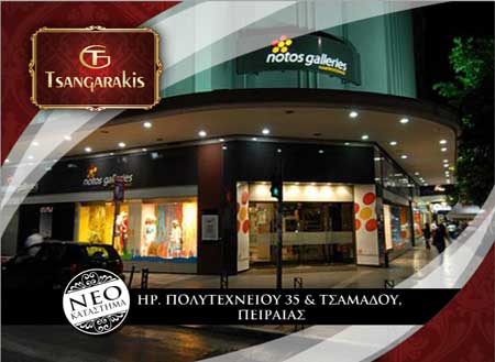 Το άνοιγμα του πρώτου καταστήματος της έκανε σήμερα η GT TSANGARAKIS στα Notos Galleries του Πειραιά. Μετά από 25 χρόνια ιστορίας υποδέχεται το κοινό στο πιο εμπορικό πολυκατάστημα. Μέσα από την συνεργασία της με τον συγκεκριμένο όμιλο τα επόμενα μαγαζιά που θα ανοίξει στις επόμενες ημέρες είναι στην Αθήνα, αλλά και στην Θεσσαλονίκη. Η στρατηγική αυτή απόφαση συνεργασίας με τα συγκεκριμένα πολυκαταστήματα αποτελεί την συνέχεια της δυναμικής ανάπτυξης του ομίλου GΤ Tsangarakis που συνεχίζει μετά από 25 χρόνια να υπογράφει την ποιότητα, σε συνδυασμό με την υψηλή αισθητική αλλά και το προσιτό κόστος που καθιέρωσαν το brand στην ελληνική αγορά. Τα δύο τελευταία χρόνια ο όμιλος έχει αρχίσει τη δυναμική επέκτασή του και σε άλλες αγορές του εξωτερικού.