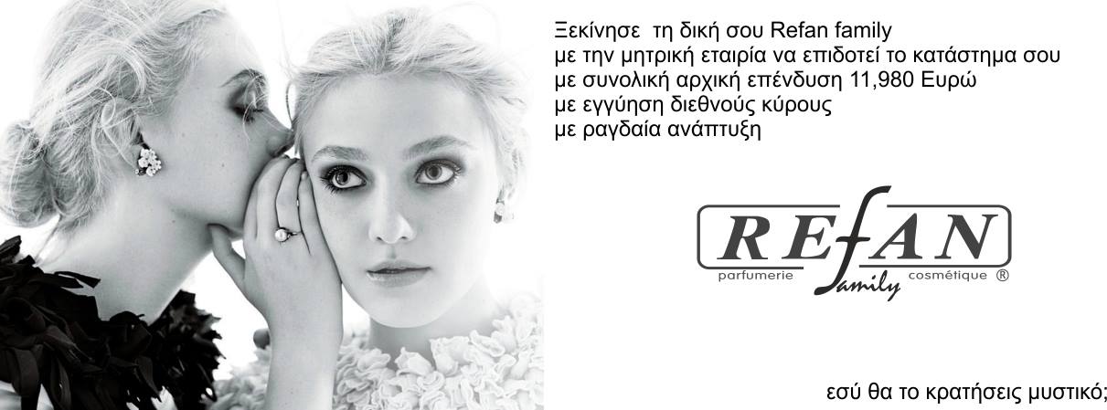 Η λύση σε όσους είναι εγκλωβισμένοι στην ανεργία και για όσους επιθυμούν ένα καλύτερο μέλλον με την ελάχιστη επένδυση έρχεται με τα REFAN family! Η μητρική εταιρεία επιδοτεί τα νέα καταστήματα, συμπιέζοντας την συνολική αρχική επένδυση και αναπτύσσεται ραγδαία με δεκάδες καταστήματα στην Ελλάδα και εκατοντάδες στο εξωτερικό, κατακτώντας όλες τις εμπορικές αγορές, προσφέροντας την προσιτή πολυτέλεια στους γνώστες του αρώματος και των φυσικών καλλυντικών.